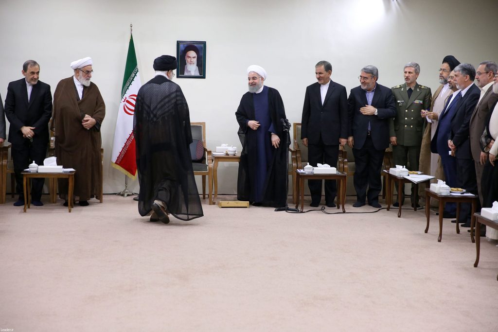 ایشان افزودند: در عرصه دیپلماسی باید چابک، بروز، سریع و هوشیار عمل کرد و به فضل الهی در آینده نیز همانگونه که تاکنون پیش رفته اید و در مقابل دشمنان ایستاده اید، عمل کنید. پیش از سخنان رهبر انقلاب اسلامی، آقای روحانی گزارشی از اقدامات دولت یازدهم و برنامهها و اهداف دولت دوازدهم بیان کرد. رئیسجمهور، مهمترین معضل پیش روی دولت را مسئله بیکاری و مشکلات اقتصادی خواند و افزود: نظام بانکی، صندوقهای بازنشستگی، نبود تعادل در بودجه، مسئله آب و مشکلات محیط زیست از دیگر مسائلی است که باید در چهار سال آینده حل شوند. آقای روحانی با برشمردن اهداف اصلی دولت دوازدهم، خاطرنشان کرد: هدف اول دولت حل مشکل بیکاری است و تلاش می کنیم سالانه بیش از ۹۰۰ هزار شغل ایجاد شود. رئیسجمهور، «تحقق رشد ۸ درصدی، مبارزه با فقر و تحقق عدالت اجتماعی» را از دیگر اهداف دولت برشمرد و با بیان اینکه برای رسیدن به رشد ۸ درصدی نیازمند ۷۷۵ هزار میلیارد تومان سرمایهگذاری جدید در سال هستیم، افزود: برای رسیدن به این هدف، بودجه و امکانات دولت کافی نیست و باید بانکها، بازار سرمایه، صندوق توسعه ملی و سرمایه بخش خصوصی به میدان بیاید و سرمایه خارجی نیز جذب شود. آقای روحانی، تورم سالانه را کمتر از ۸ درصد خواند و افزود: تلاش دولت دوازدهم این است که تورم را تک رقمی نگه دارد. رئیسجمهور افزود: سال گذشته سالی استثنایی برای اقتصاد کشور بود زیرا شاهد رشد اقتصادی دو رقمی بودیم و رشد اقتصادی ایران در جهان اول شد. آقای روحانی با اشاره به لزوم مردمی کردن اقتصاد و اصلاح نظام بانکی گفت: اگر بخواهیم به این اهداف برسیم، باید سود بانکی کاهش یابد و وزارتخانهها و بانکها از بنگاهداری دست بردارند. رئیسجمهور با بیان اینکه به مردم قول دادهایم فقر مطلق تا پایان دولت دوازدهم ریشهکن شود، خاطرنشان کرد: برای رسیدن به این هدف باید با تحول مالیاتی، فاصله دو دهک بالا و پایین جامعه کم، و فقر مطلق ریشهکن شود. آقای روحانی، «نوسازی و بازسازی صنایع»، «تحول در اقتصاد دانشبنیان» و «اتکاء به درآمدهای غیرنفتی» را از دیگر برنامههای دولت خواند و افزود: دولت دوازدهم بیش از گذشته با مشکلات آشناست و همه باید برای حل مشکلات کشور به دولت کمک کنند. رئیسجمهور همچنین گفت: تلاش شد در انتخاب وزرا و معاونان رئیسجمهور، افرادی کارآمد و شایسته بدون وابستگی جناحی و حزبی دعوت به کار شوند. در پایان این دیدار، نماز ظهر و عصر به امامت رهبر انقلاب اسلامی اقامه شد.